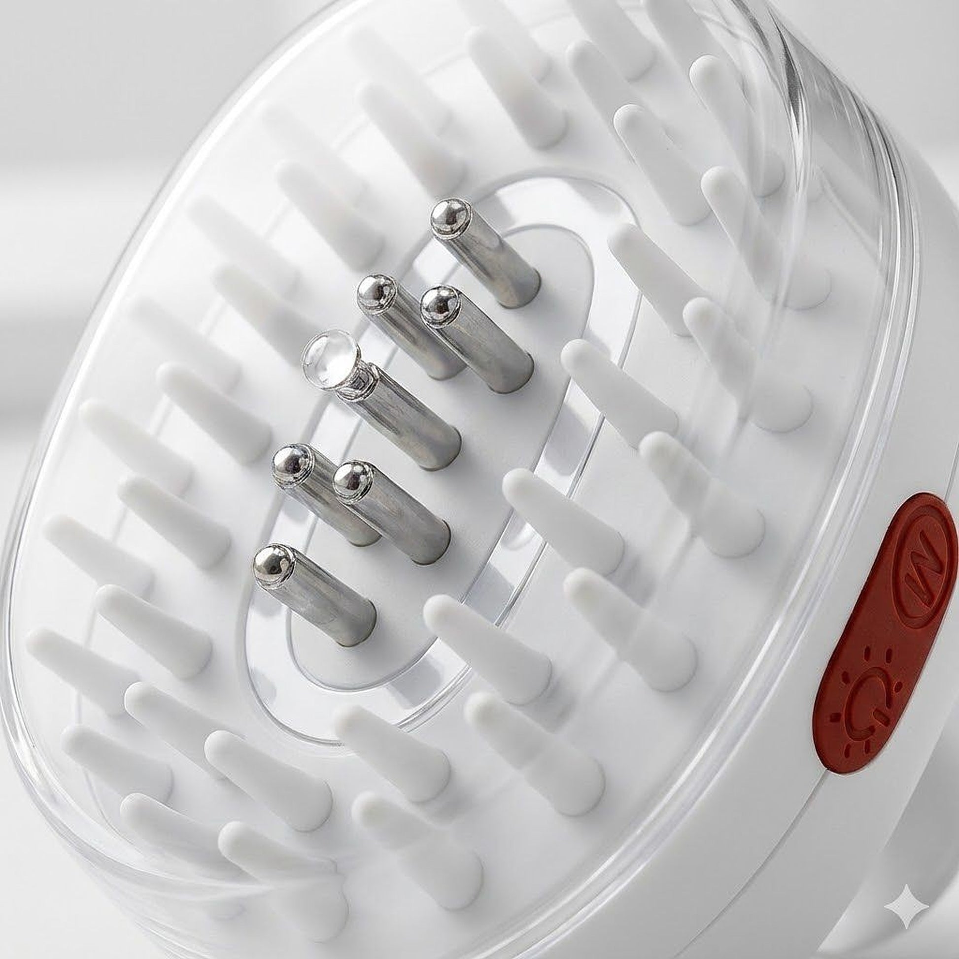 Die Kombination aus Lichtimpulsen und sanfter Massage unterstützt die Durchblutung und verbessert die Aufnahme von Seren und Pflegeprodukten – direkt an der Haarwurzel. -