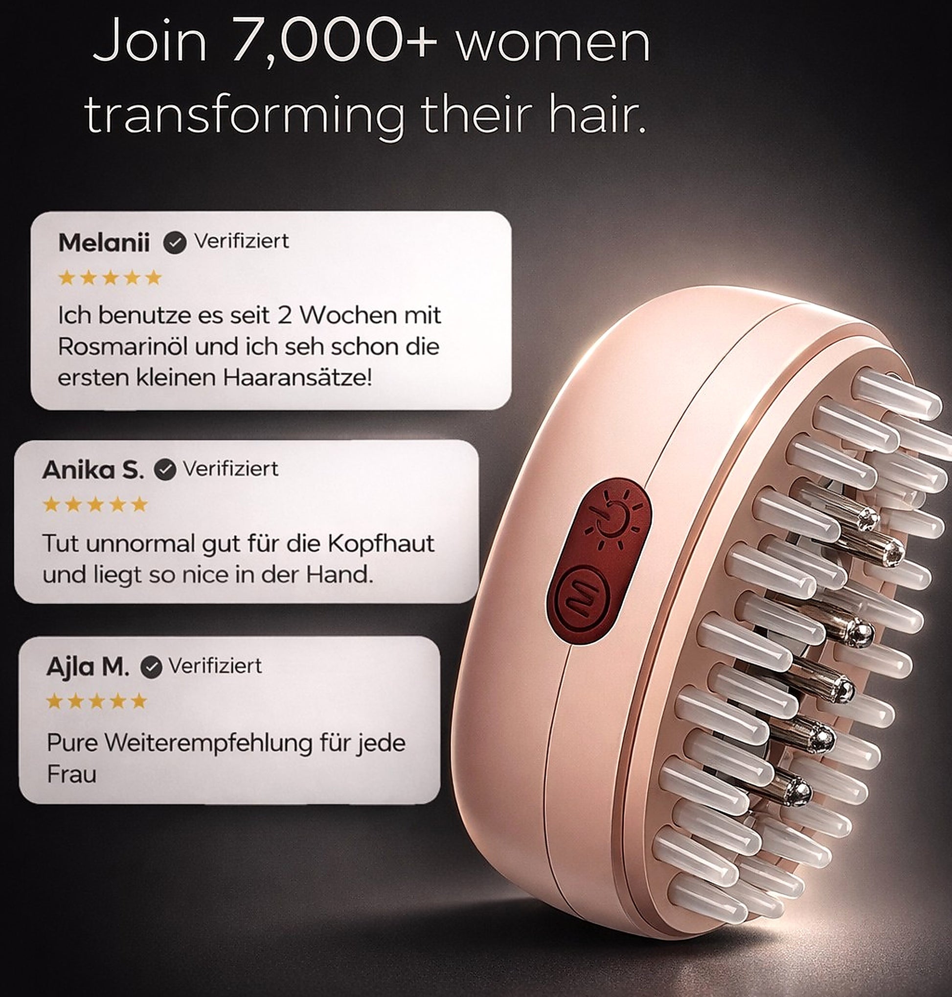 Unsere LED-Lichttechnologie stimuliert die Kopfhaut gezielt und schafft optimale Bedingungen für kräftigeres, gesünder wirkendes Haar.